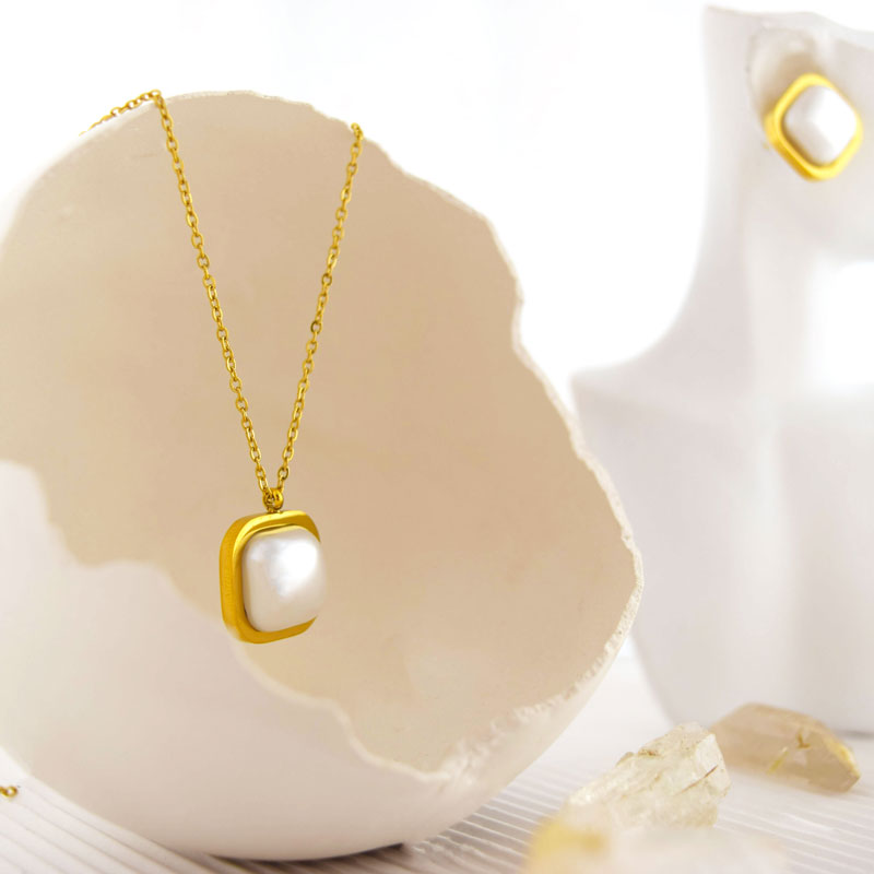 Elevate your elegance with this chic gold-plated necklace and earring set, featuring a bold square bezel design with a luminous high-polish faux pearl centerpiece. The perfect blend of modern minimalism and classic charm, this set is ideal for day-to-night sophistication.