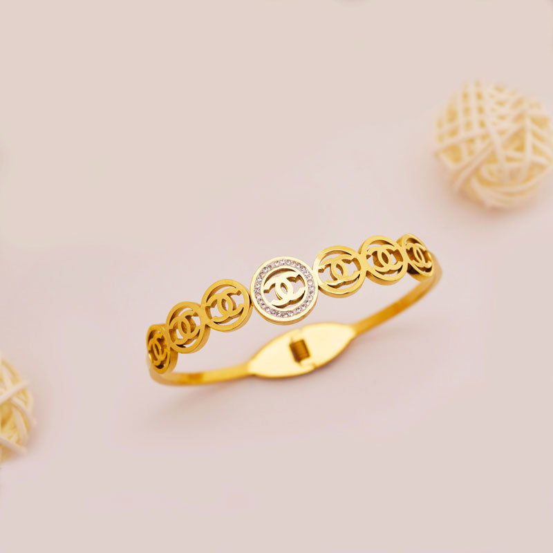 Channel timeless Parisian glamour with the CC Luxe Circle Bracelet. Crafted in radiant gold-tone stainless steel, this bracelet features repeating interlocked CC emblems with a crystal-embellished centerpiece that adds a subtle sparkle. Perfect for elevating both casual and evening looks; this piece is an instant wardrobe staple for every fashion-forward woman.