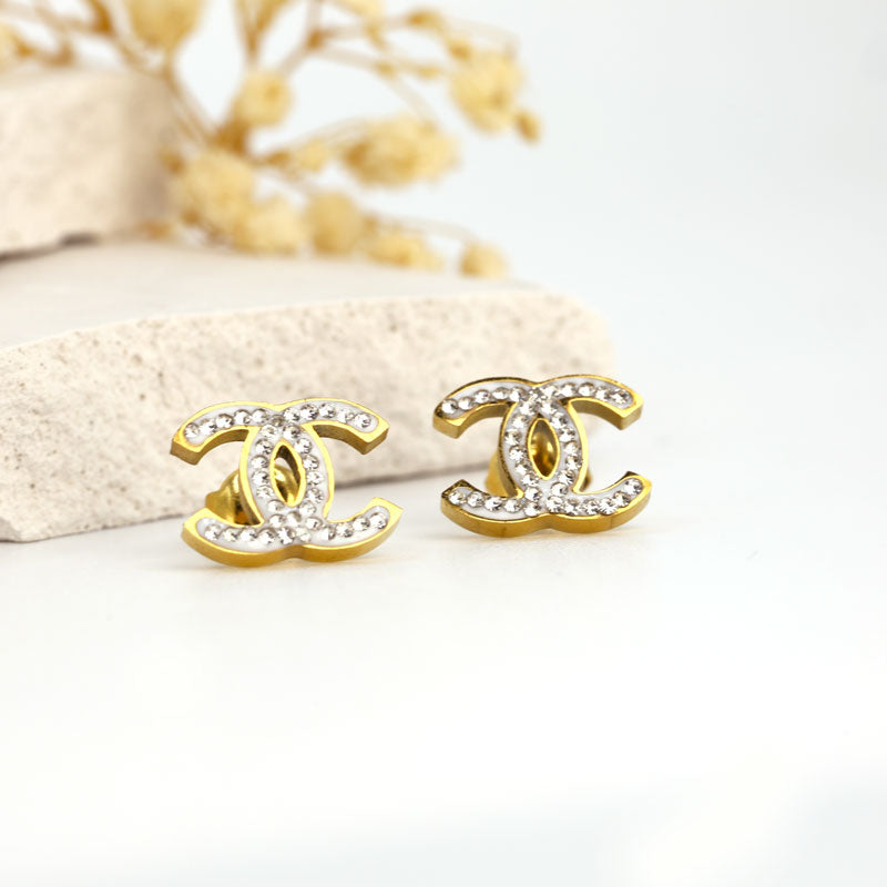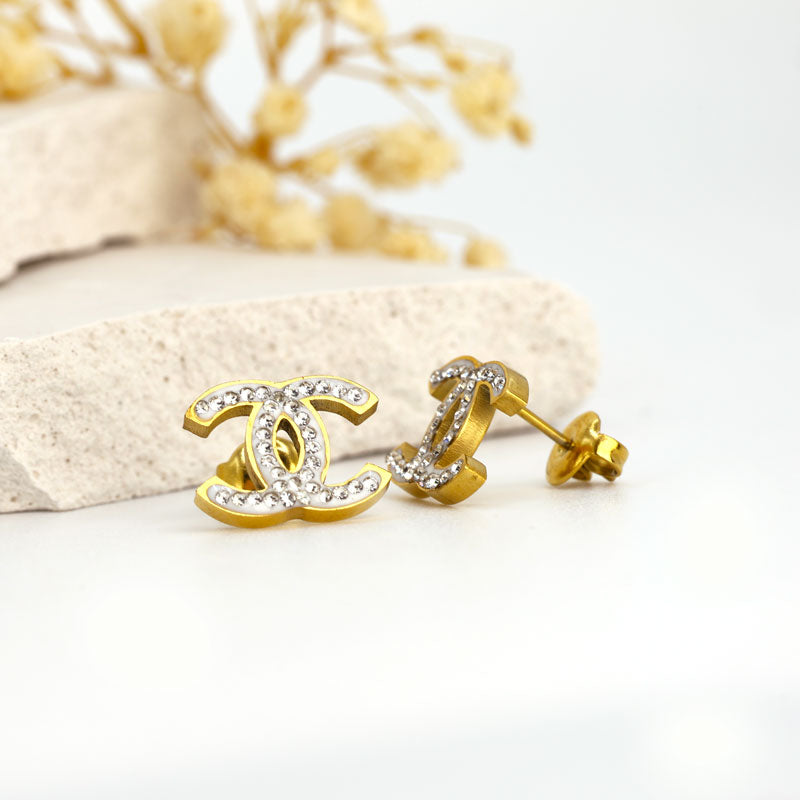 Elevate your look with these Chanel-Inspired Double C Stud Earrings, featuring a classic gold-tone logo adorned with sparkling crystals. A perfect blend of luxury and sophistication, ideal for both casual chic and elegant evenings.