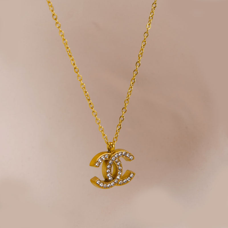 Make a bold statement with this luxurious gold-tone necklace featuring a twin-C pendant encrusted with sparkling crystals. Perfectly balancing elegance and edge, this designer-inspired piece adds instant glamour to your look — ideal for parties, gifting, or elevating your everyday style.