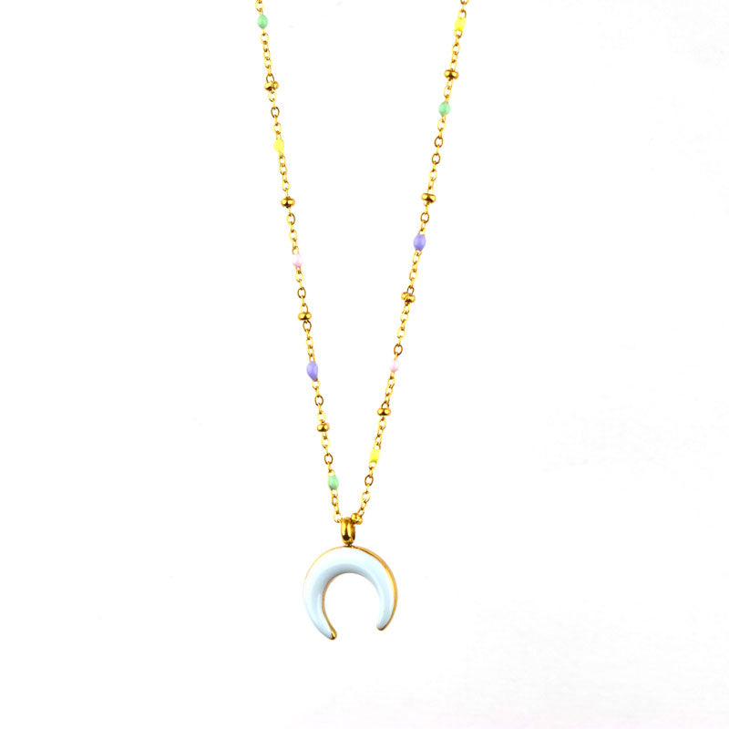 Embrace celestial elegance with this crescent moon pendant necklace, featuring a glossy white enamel charm on a dainty gold chain adorned with pastel multicolor beads. Perfect for everyday wear or layering, this necklace brings a whimsical yet graceful touch to your jewelry collection.