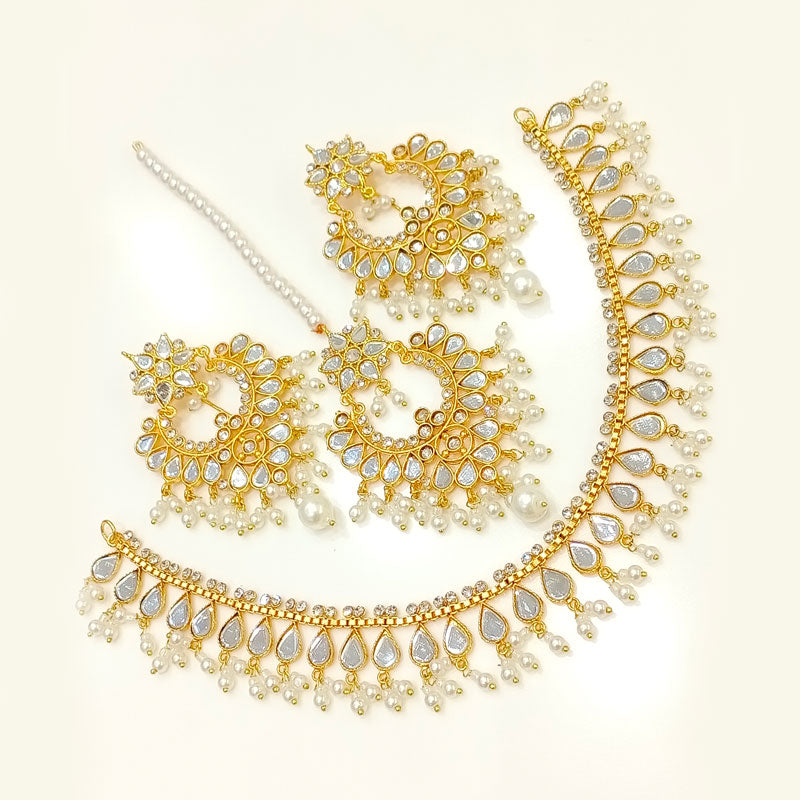 Elevate your bridal look with this stunning gold-plated Kundan jewelry set, featuring a beautifully handcrafted choker, matching earrings, and a delicate maang tikka. Adorned with premium white stones and pearl droplets, this set offers a perfect blend of elegance and traditional charm—ideal for brides, wedding events, and festive occasions.