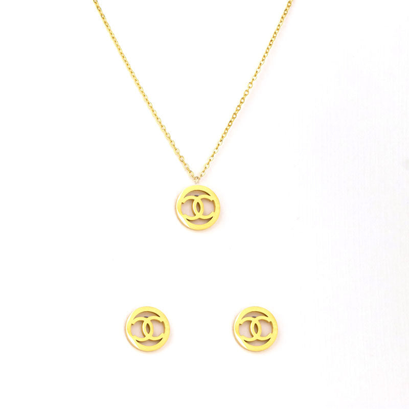 Showcase your style with this stunning gold round pendant and matching earrings, designed with an elegant cutout emblem. Its minimalist charm and iconic-inspired look make it a perfect statement piece for everyday wear and gifting.