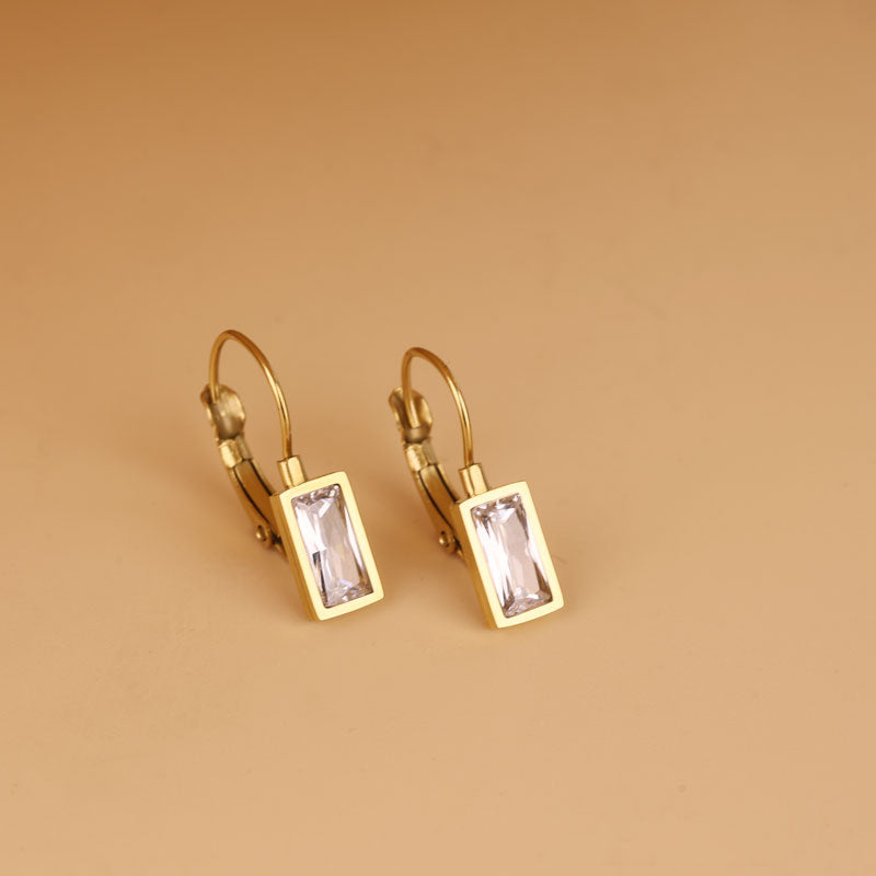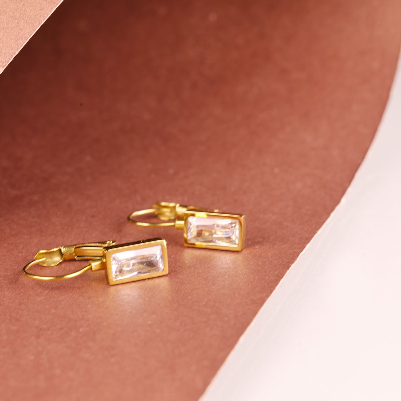 Sleek and sophisticated, our Golden Baguette Crystal Drop Earrings feature a rectangular-cut clear crystal set in a minimalist gold-tone frame. These elegant drops add a refined sparkle to any look—perfect for evening events, workwear, or timeless everyday glamour. Lightweight with secure lever-back closure.