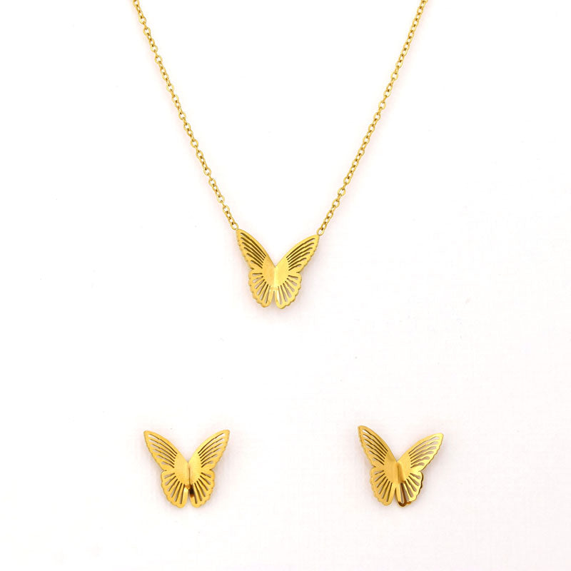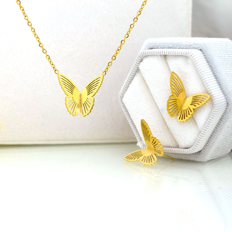 Add a whimsical touch to your look with this elegant butterfly charm necklace and matching earrings set. Crafted in gold-tone stainless steel, the delicate butterfly motif symbolizes transformation and grace, perfect for everyday wear or gifting.