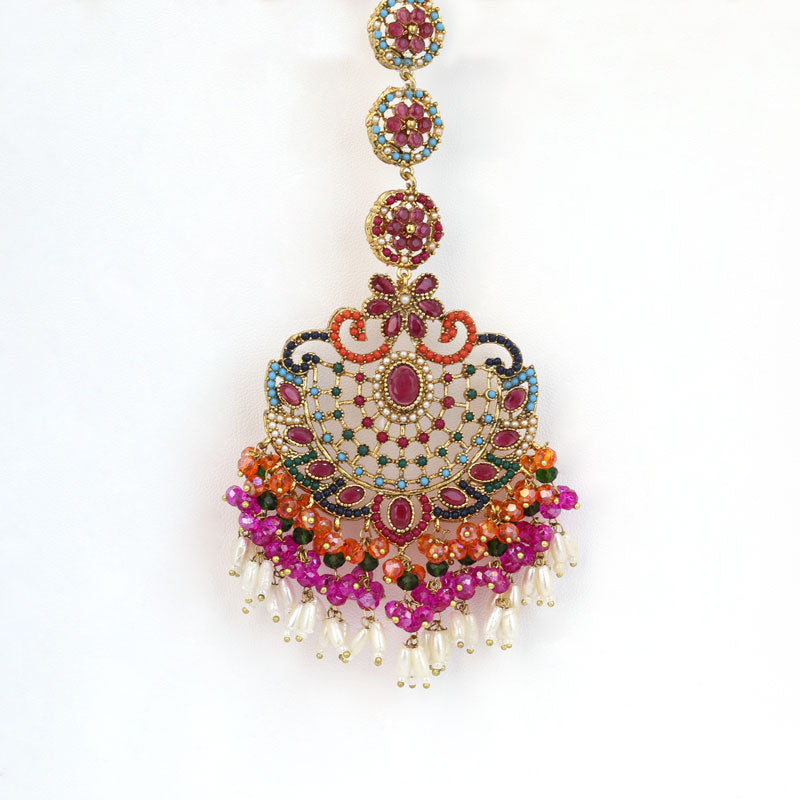 Dazzle in vibrant elegance with Facet’s Gulbahar Jhumka Set — a breathtaking creation adorned with multicolor stones, delicate pearls, and handcrafted gold detailing. Its intricate design reflects festive artistry and timeless tradition, perfect for weddings, mehndi celebrations, and formal events. Available in multiple color options to match every occasion.