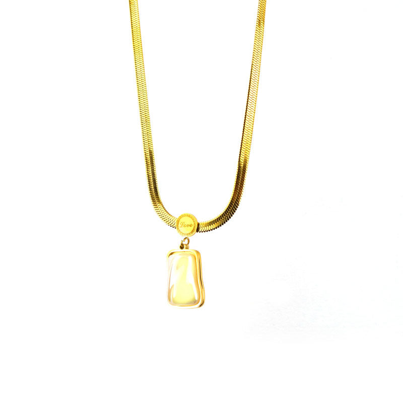 Elevate your elegance with this luminous baroque-inspired pendant, featuring an irregular shell-like charm framed in polished gold. Suspended from a bold gold snake chain with a dainty "Love" charm accent, this statement piece adds a modern twist to timeless natural beauty. Ideal for minimal luxe styling.