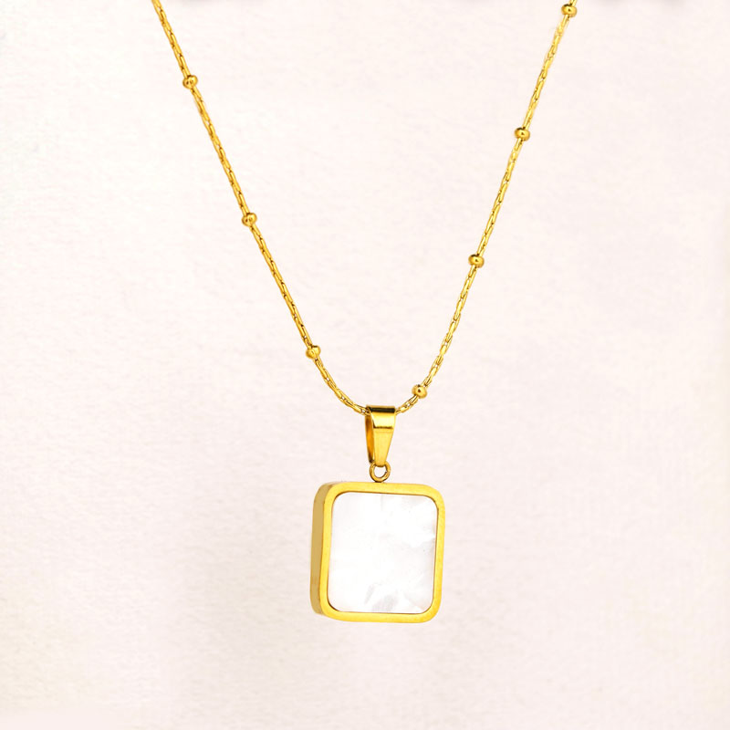 Delicately crafted, the Luna Frost Pendant features a rectangular mother-of-pearl centerpiece set in a smooth gold bezel. Its iridescent charm shimmers softly with every movement, evoking a sense of serene luxury. Suspended from a textured chain, this piece is perfect for layering or wearing solo for an understated, timeless statement.