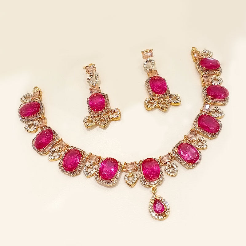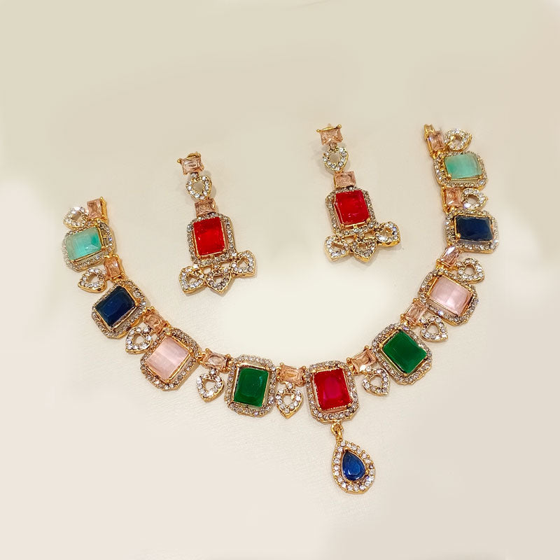 This beautifully crafted jewelry set features a premium AD stone choker paired with matching earrings and a stylish bracelet. Designed with high-quality stones, intricate detailing, and a modern elegant finish, this set is perfect for bridal wear, party looks, and festive occasions. A timeless statement piece for any special event.