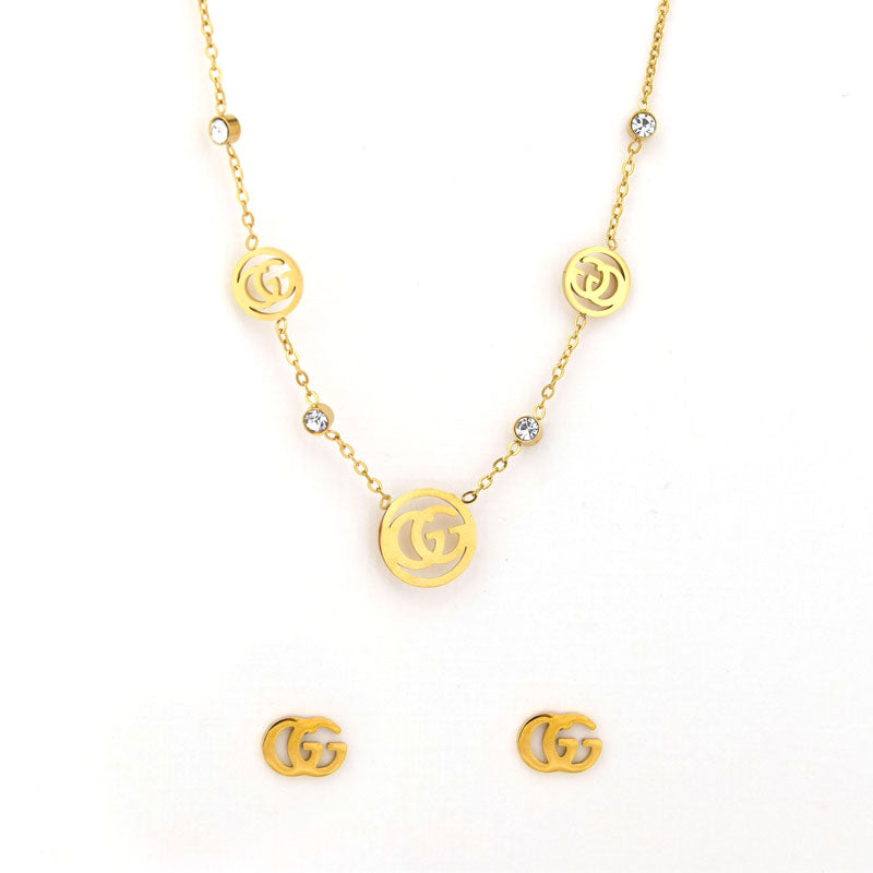 Elevate your style with this matching GG monogram necklace and earrings set, crafted in radiant gold plating. Featuring iconic double-G logos and minimalist detailing, this trendy set is perfect for both daily wear and special occasions.