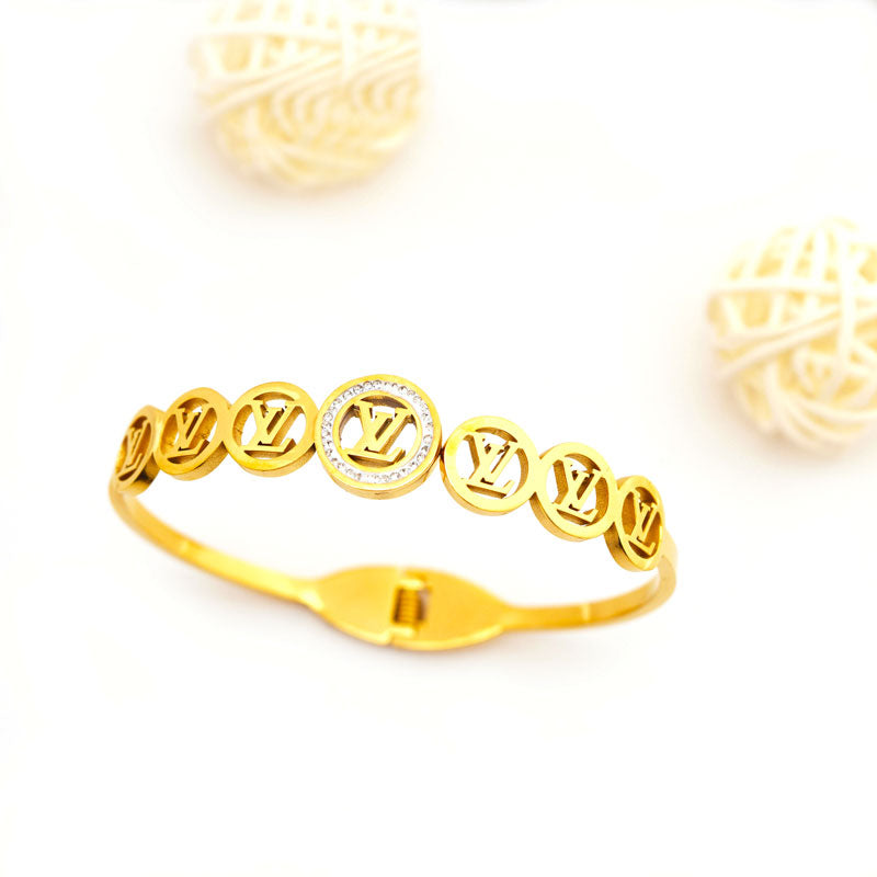 Elevate your everyday elegance with the LV Luxe Circle Bracelet. Featuring a series of round gold-toned emblems engraved with the iconic LV insignia, this bracelet embodies timeless sophistication. The center charm is encrusted with dazzling crystals for a refined pop of sparkle, making this piece a luxurious statement for both casual and formal wear.