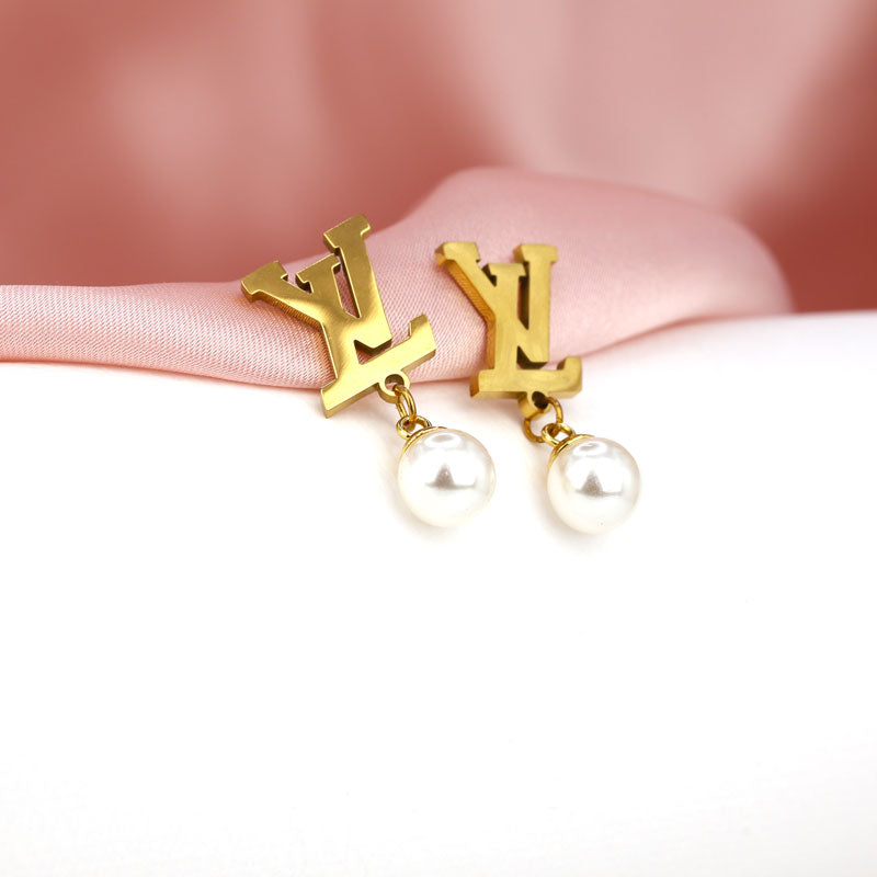 Add timeless elegance to your jewelry collection with these LV-inspired gold earrings, featuring a chic pearl drop. Perfect for both formal events and everyday luxury styling.