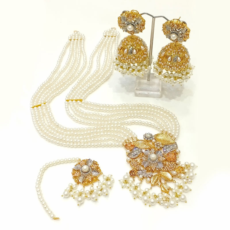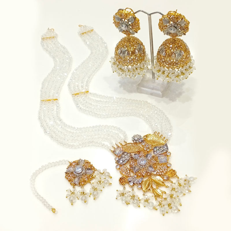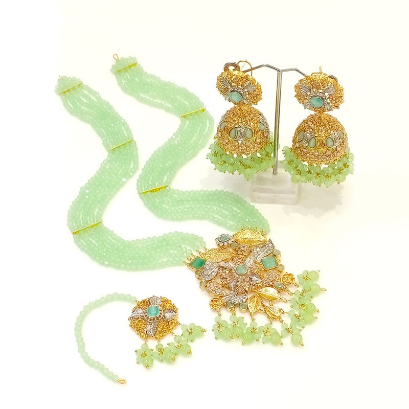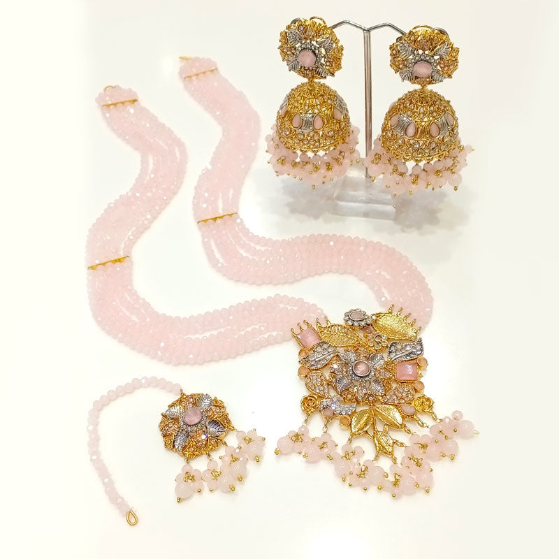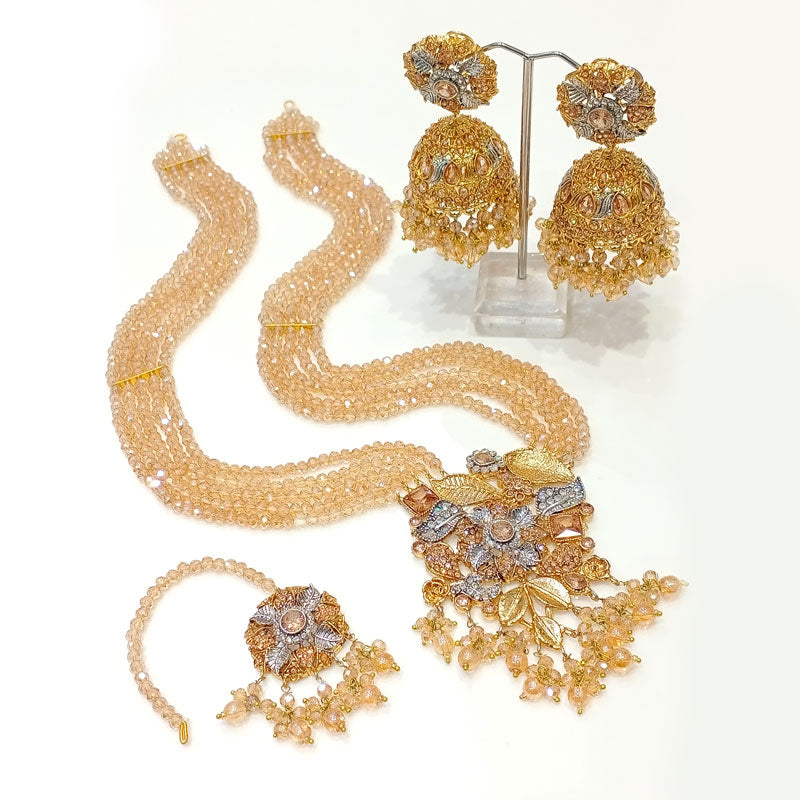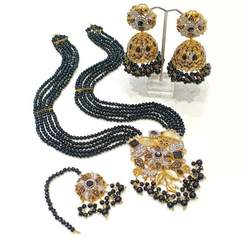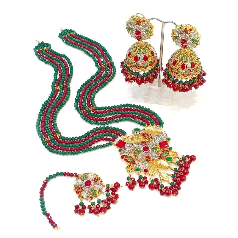 The Mehrban Heritage Beaded Mala Set is a statement traditional jewelry ensemble featuring a multi-strand beaded mala necklace with an intricately crafted centerpiece, paired with matching jhumka earrings and a coordinating ring. Designed with fine detailing, delicate stone accents, and elegant hanging elements, this set blends classic craftsmanship with festive grandeur. Ideal for weddings, mehndi events, and formal celebrations, it is available in multiple color variations to complement a wide range of traditional outfits.