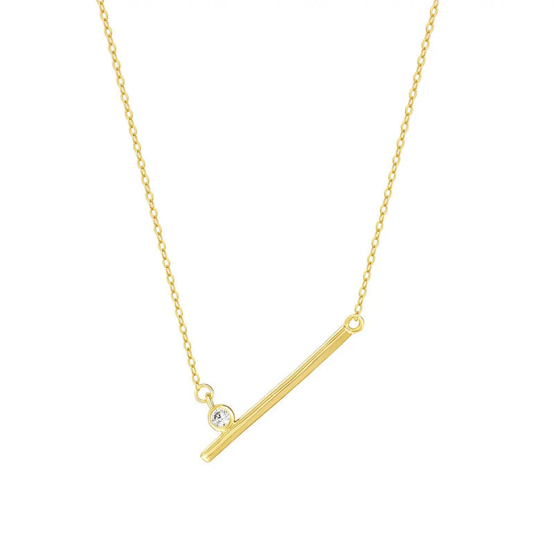 Sleek and modern, this minimalist gold bar necklace features a delicate solitaire crystal charm that adds a subtle sparkle to any look. Perfect for layering or everyday wear, it's an elegant staple for the contemporary jewelry lover.