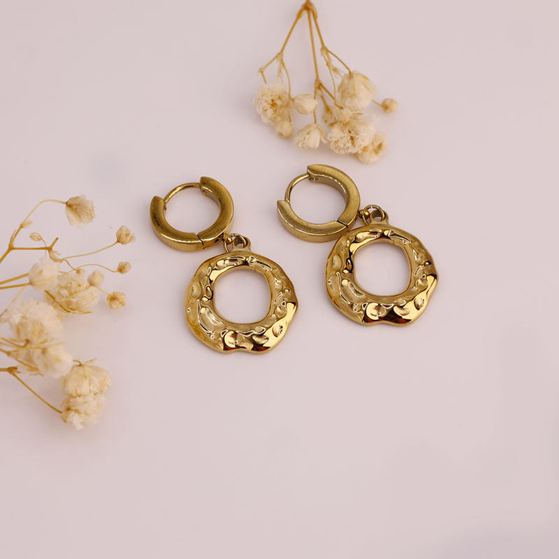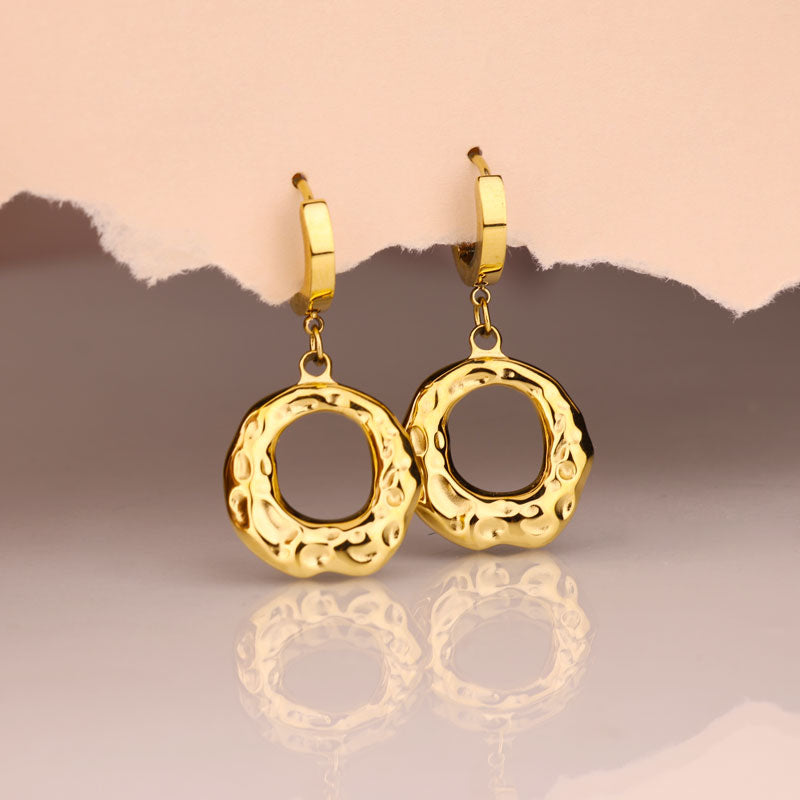 Turn heads with our Molten Texture Gold Dangle Earrings – featuring a bold, organic circle design with a high-shine hammered finish. These statements drop earrings bring modern artistry and fluid form to any look. Lightweight with a secure hoop clasp for effortless all-day wear.
