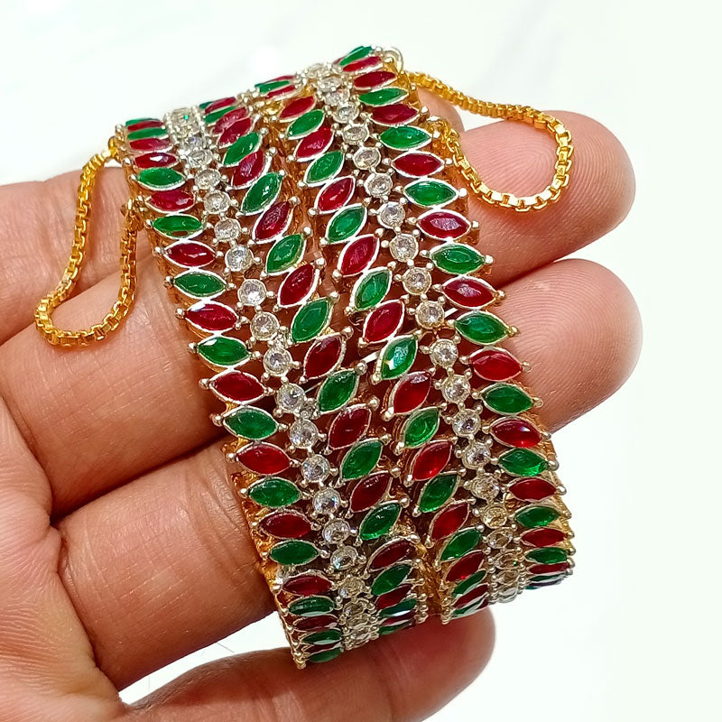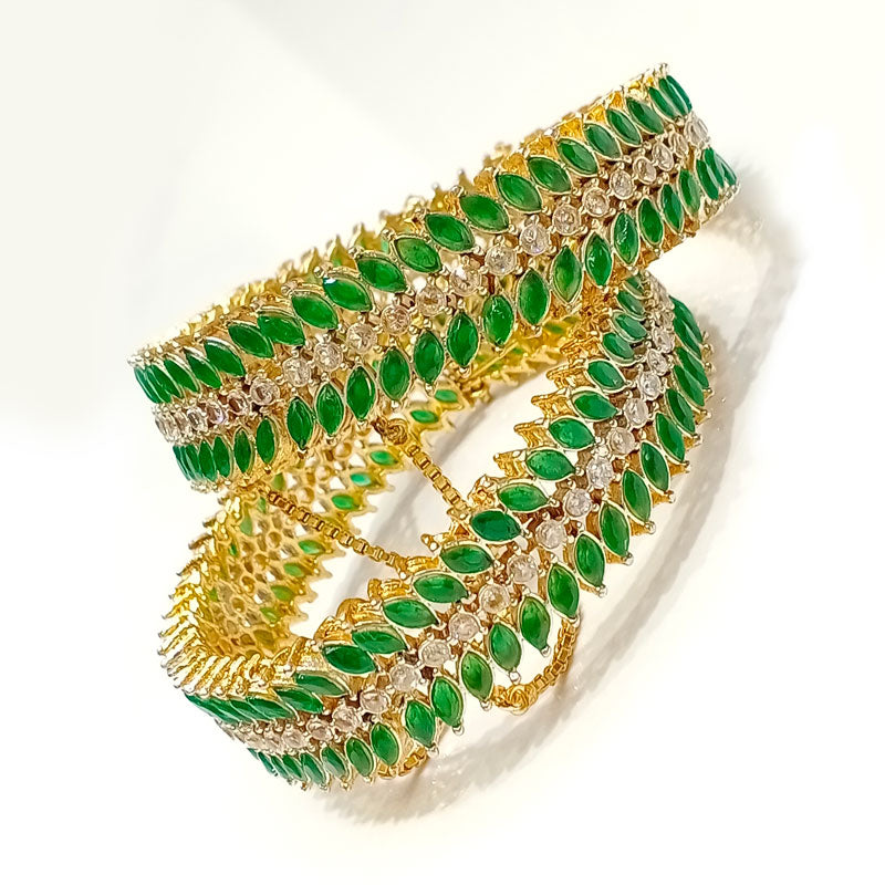 The Nayab Leafwork Statement Bangles feature an elegant marquise-cut stone pattern arranged in a graceful leaf motif, finished with fine crystal detailing and a luxurious gold-tone base. Designed for bridal and festive wear, these bangles offer a bold yet refined silhouette that complements traditional outfits beautifully. Available in multiple color variations, they are perfect for weddings, mehndi, and special occasions.