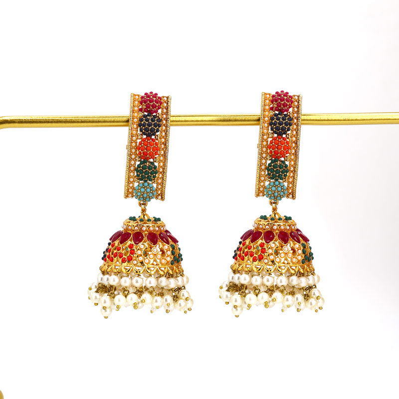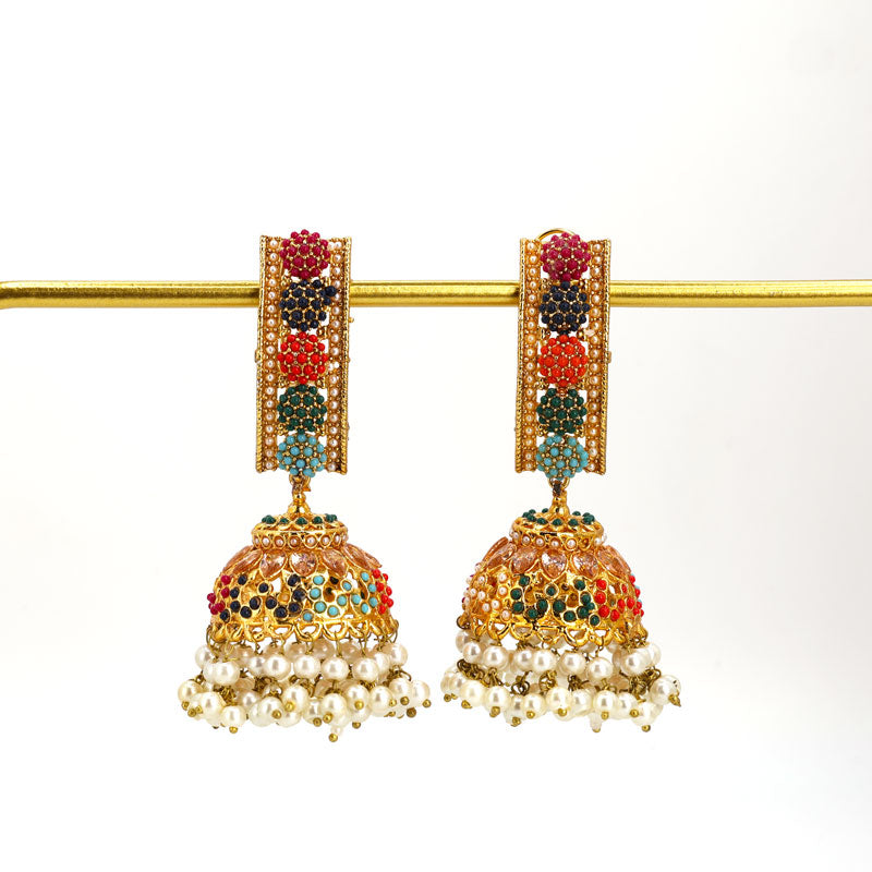 Step into timeless elegance with Facet’s Noor Mahal Jhumka Earrings — adorned with vibrant multicolor stones, intricate gold detailing, and cascading pearl drops. Perfect for weddings, mehndi, and festive celebrations, these handcrafted earrings blend traditional artistry with a royal modern touch. Available in stunning color options to match every outfit.
