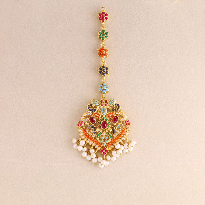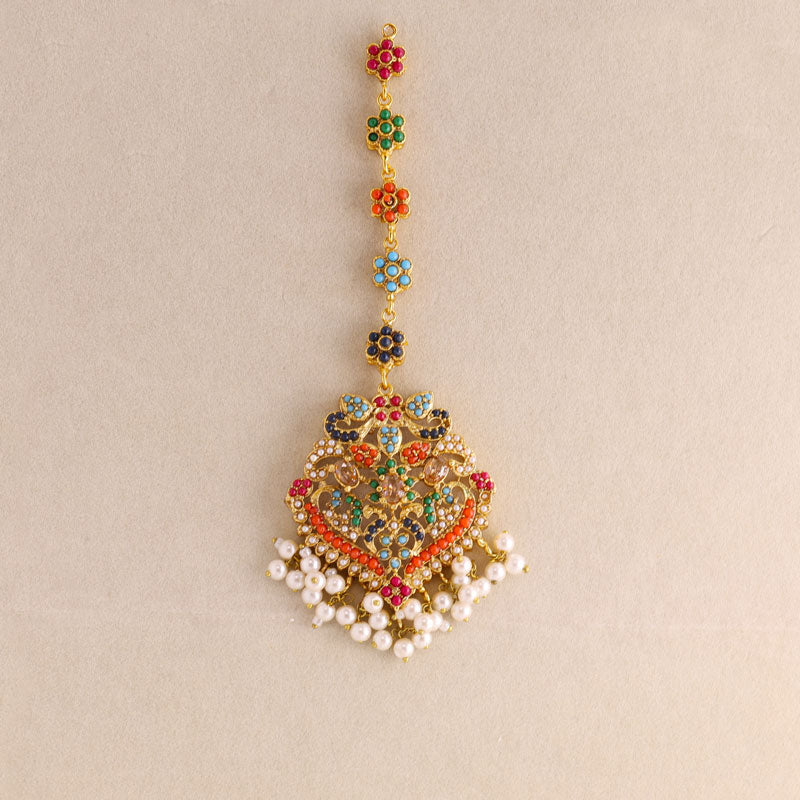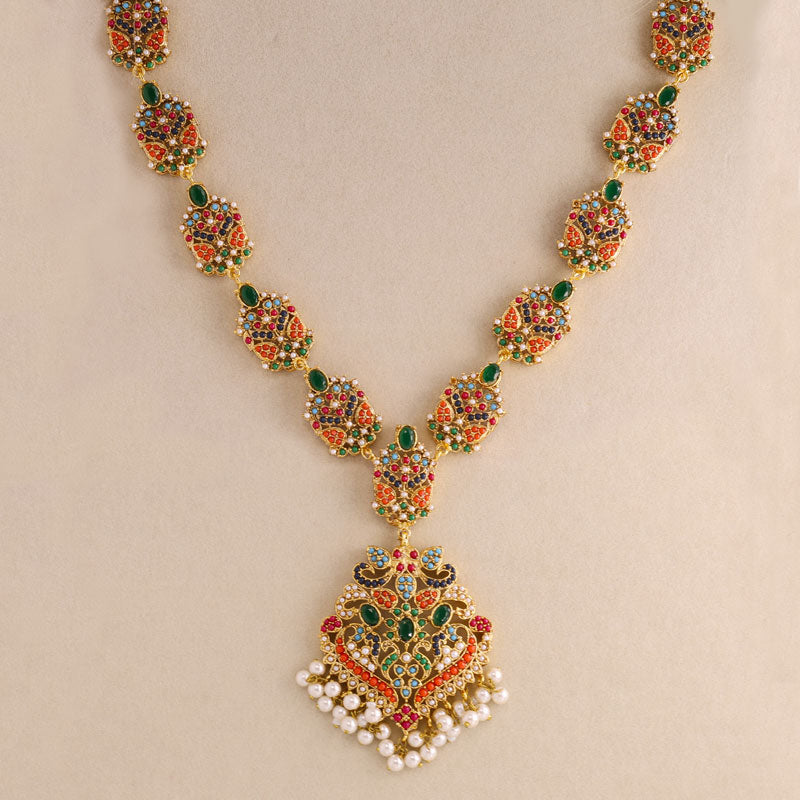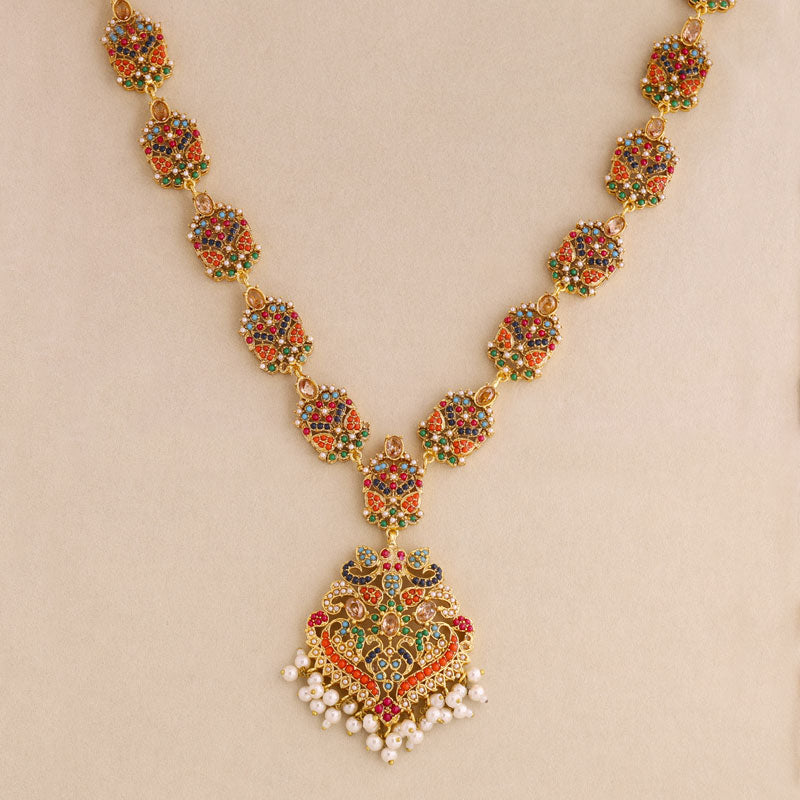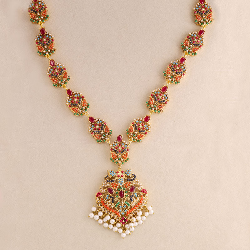 Add royal elegance to your look with this handcrafted multicolor Kundan necklace set featuring vibrant green stones, red and blue accents, and delicate pearl drops. Perfect for weddings, festive occasions, and traditional celebrations, this gold-plated jewelry set includes a statement necklace and matching earrings for a timeless ethnic charm.