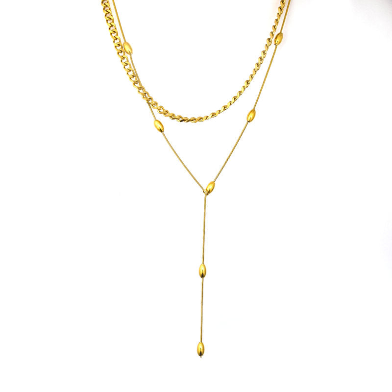 The Sahara Drop Layered Chain Set is a refined fusion of bold and delicate. Featuring a chunky gold curb chain paired with a fine snake chain adorned with polished drop beads, this duo creates effortless layering with timeless appeal. Perfect for elevating both casual and formal outfits, it’s a must-have for your capsule jewelry collection.