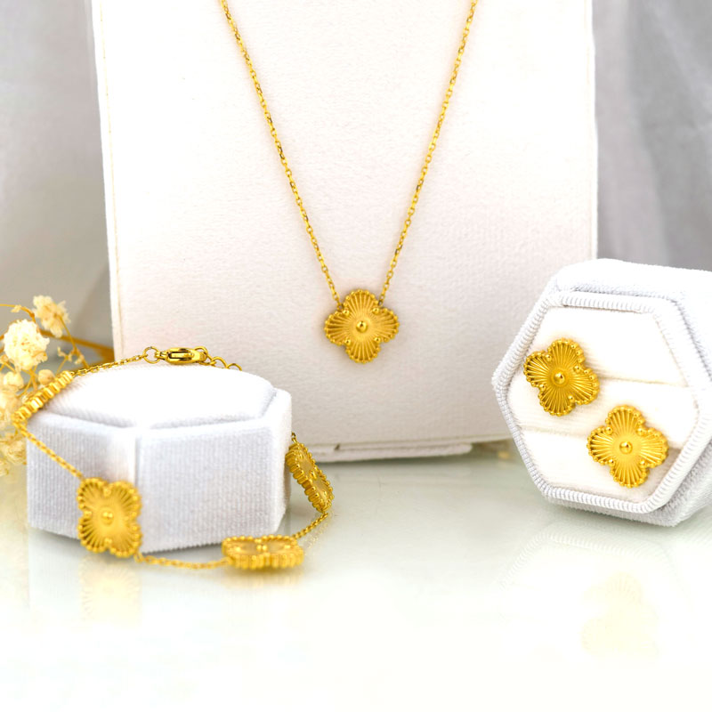 Make a graceful statement with this intricately crafted gold flower jewelry set, featuring petal-inspired textures and a radiant brushed finish. The coordinated necklace, earrings, and bracelet set adds a touch of luxury to both casual and formal looks.