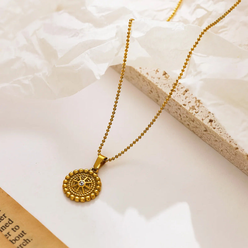Elevate your spiritual style with this celestial mandala pendant, intricately designed in gold plating and adorned with a central sparkling crystal. Perfect for layering or wearing solo, this piece blends elegance with symbolic charm for everyday inspiration.