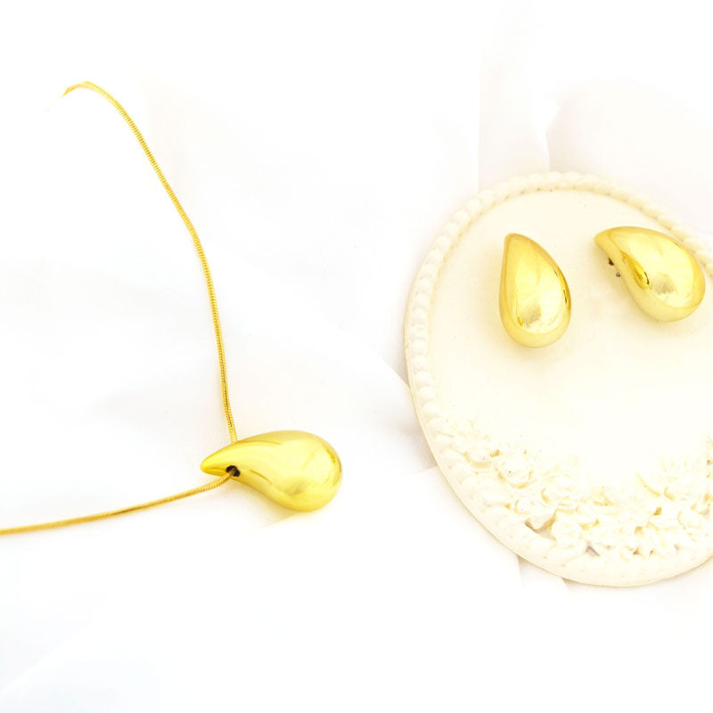 Add a touch of bold elegance with this minimalist gold teardrop jewelry set, featuring a sleek, high-polish finish. The fluid design of the pendant and matching earrings makes this set perfect for contemporary styling and everyday glamour.