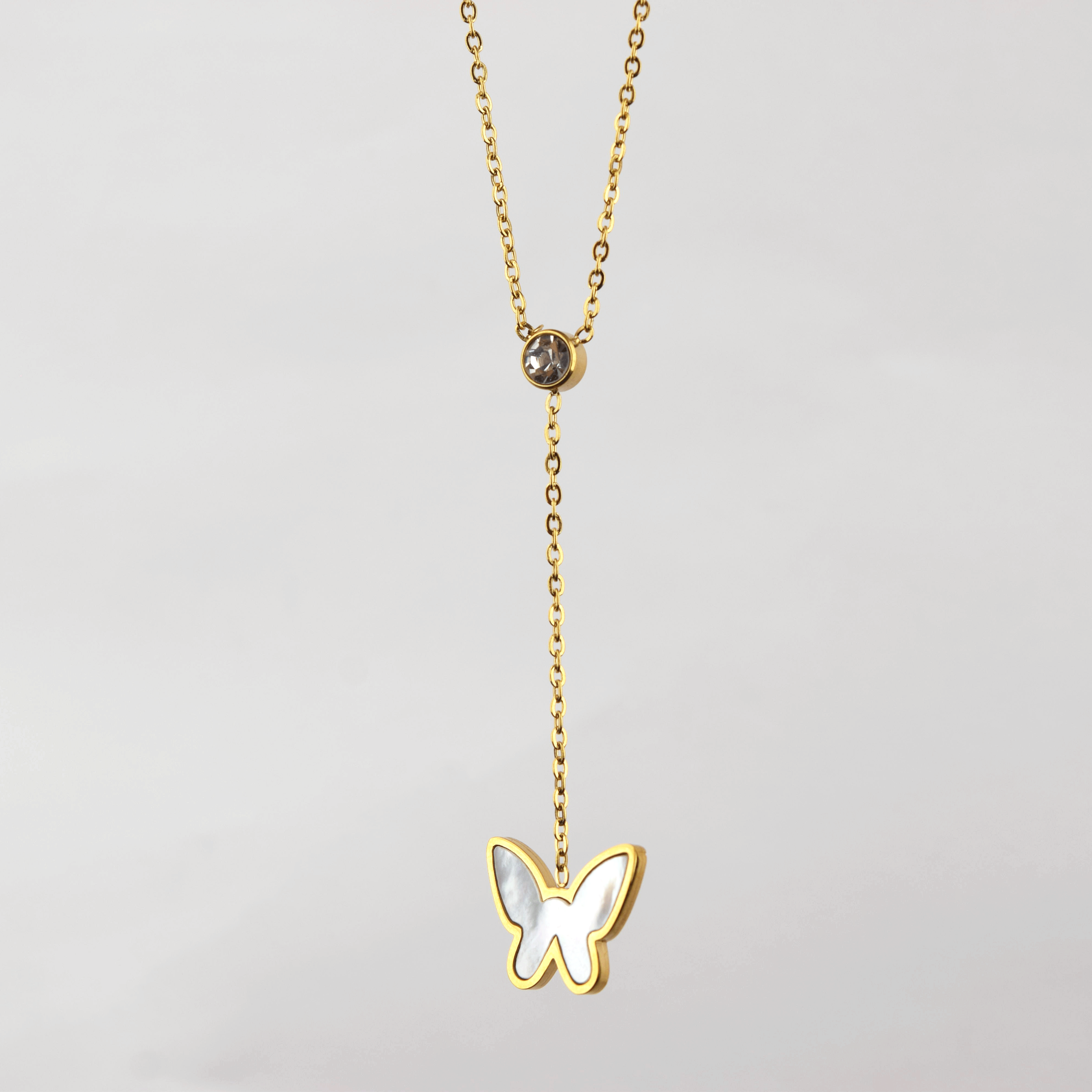 Delicate and graceful, this gold-plated necklace features a charming mother of pearl butterfly pendant suspended from a fine link chain. A subtle crystal accent adds sparkle, making it a perfect choice for everyday elegance or thoughtful gifting. Symbolizing transformation and beauty, this necklace is a must-have for feminine and modern jewelry collections.