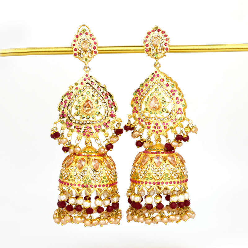 Radiate regal splendor with Facet’s Zeenat Multicolor Royal Jhumka Earrings — a breathtaking fusion of gold tones, champagne hues, and vibrant gemstones. Handcrafted to perfection, these statement earrings feature intricate detailing, pearl accents, and a luxurious finish — ideal for weddings, festive wear, and grand celebrations. Available in multiple color options.
